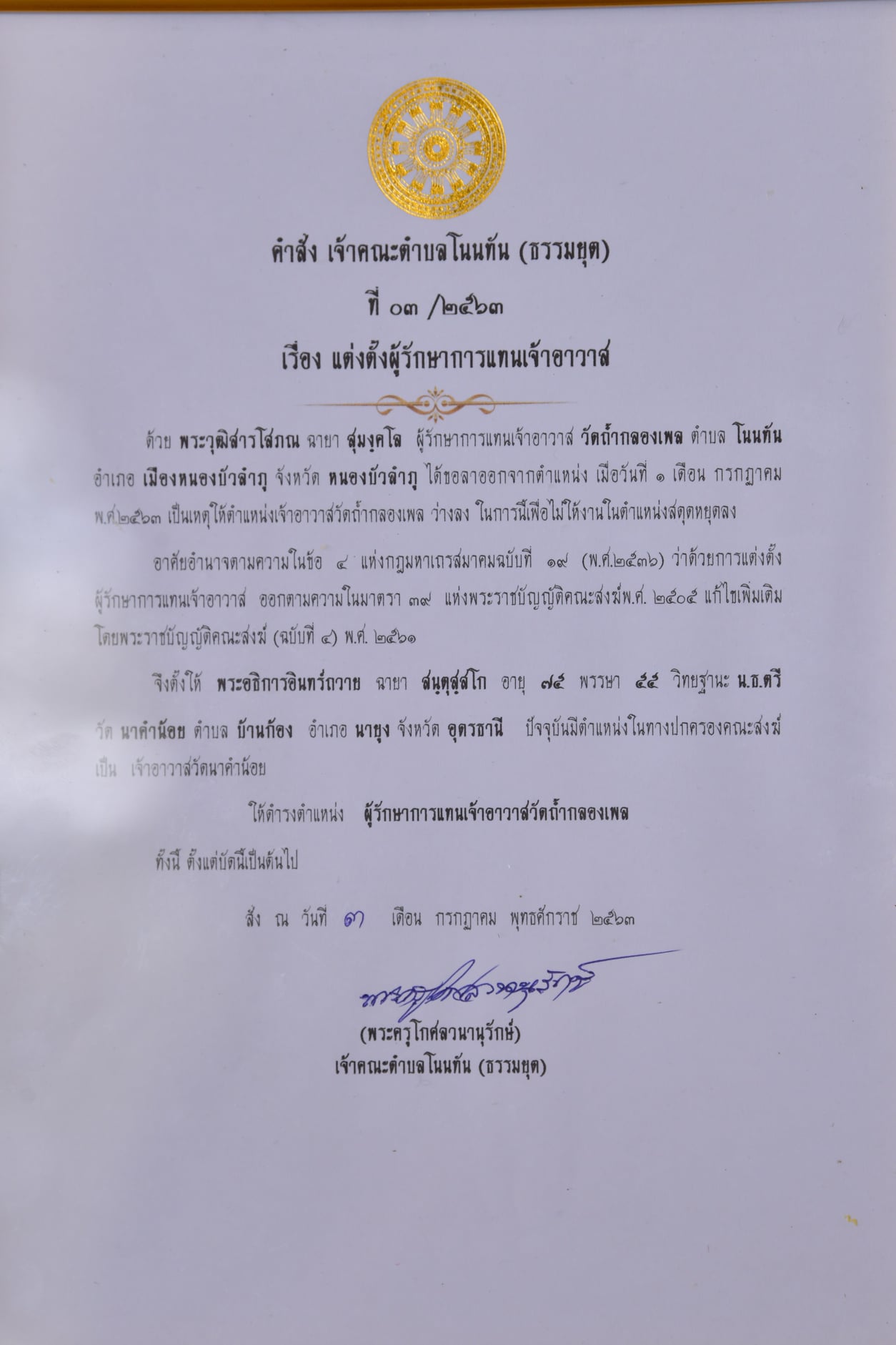 กิจการสงฆ์ นำโดย ท่านพระอาจารย์อินทร์ถวาย สันตุสฺสโก แห่งวัดป่านาคำน้อย รักษาการเจ้าอาวาสวัดถ้ำกลองเพล (3 กรกฏาคม 2563 – ปัจจุบัน)