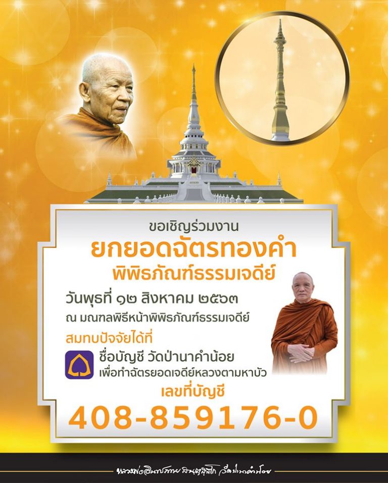 วันที่ ๑๒ สิงหาคมนี้ พวกเราจะมีการยกฉัตรยอดฉัตรพระเจดีย์ พอยกฉัตรขึ้นมาก็คงจะเหลืองอร่าม หลวงพ่อก็ขอบอกกล่าวให้คณะศรัทธาญาติโยมที่ได้ร่วมถวายทองได้รับรู้รับทราบ แต่หากผู้ใดยังไม่ได้ร่วมถวาย ก็ร่วมด้วยก็ได้ เพราะจตุปัจจัยค่าช่างประมาณ ๗ ล้านบาท และค่าอุปกรณ์อีกประมาณ ๒ ล้านกว่า รวมแล้วประมาณ ๙ ล้านกว่า ยังไม่ได้จ่ายอีกประมาณ ๓ ล้าน ๘ แสน ลูกหลานผู้ใดที่ยังไม่ได้ทำยอดฉัตรเจดีย์ขององค์หลวงตา ก็สามารถร่วมสมทบได้ที่